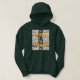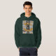 Sweat - shirt à capuche vert. Assistant Moo Alfa Nerd en jaune-orange Imprimez autour du visage d'un homme avec un Casquette Assistant Activé. Arrière - plan gris.