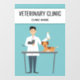 Cute design for veterinarians and veterinary clinics featuring Destei's cartoon illustration of a veterinarian man with some animals. The man is wearing a white laboratory coat while holding a grey cat and a cockatiel type parrot bird. There is also a cute little brown dog lying on a table. The background colour is blue. Personalize the sample text areas with your custom text.