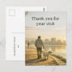 A warm, professional thank‑you postcard designed for veterinary clinics. The front features a calm, painterly scene of a person walking with their dog at sunrise, creating a friendly and welcoming tone for clients. The message “Thank you for your visit” makes this postcard ideal for routine appointments, wellness exams, vaccinations, grooming visits, and new‑client follow‑ups.