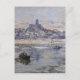 Winter image of fisherman on the river with village and tower in the background. Unique painting to send as a holiday greeting. Fine art by French artist Claude Monet.