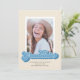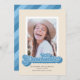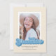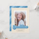 Ce amusant faire-part de graduation photo simple présente le mot "gradué" écrit dans un script de style rétro dans les tons bleus. Le dos de la carte a un motif de bande en diagonale de coordination.