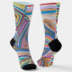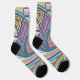 This bold abstract design features layered geometric shapes outlined in vivid colours, flowing seamlessly across a striped multicolor background. Bright shades of blue, pink, yellow, orange, green, and purple create a lively rhythm, while concentric lines and angular forms add depth and movement. The combination of organic curves and sharp edges gives the piece a modern, energetic feel perfect for those drawn to colourful contemporary patterns.