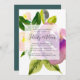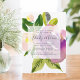 Elegant and modern floral engagement party invitation features a bouquet of vibrant plum purple and blush pink watercolor flowers accented with buds and lush greenery. Your engagement party details are overlaid on a sheer white element in elegant inky off-black lettering accented with handwritten style calligraphy.
