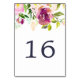 Garden floral table number cards feature a top border of watercolor rose and peony flowers in lush shades of violet purple, blush pink and green, with your table number in midnight blue. Design repeats on reverse side. Coordinates with our Vibrant Bloom wedding invitation suite.