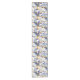 A sophisticated dining room Art Deco table runner adorned with A geometric pattern composed of various shapes and lines. It features semi-circles, rectangles, and squares, each with different summer colours combinations. The dominant colours are blue, yellow, and white. The design is symmetrical, with each half mirroring the other. The pattern is intricate, with lines forming concentric circles and intricate patterns within the shapes.
