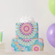 This eye-catching design features an explosion of oversized boho-style flowers in pastel tones of pink, blue, and yellow. The floral elements are bold and artistic, with intricate circular details at the centres of the flowers. The dynamic composition exudes a lively, carefree vibe, with bright colours and playful shapes radiating energy and joy. The combination of soft pastels and vivid contrasts creates a harmonious, cheerful pattern that feels both modern and whimsical.