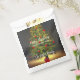 This customizable favour bag instantly captures the cozy holiday spirit with its striking, painterly design. The centerpiece is a classic Christmas tree, rendered in deep green, glowing with golden lights and adorned with vivid red ornaments. This festive scene is set against a dramatic, dark grey background, making the colours intensely vibrant. A small red wrapped gift anchors the base. The bag is fully personalized with a warm "Merry Christmas & Happy New Year" message followed by your family name. It's the perfect elegant packaging for treats and favours, merging timeless holiday cheer with a bespoke touch.
