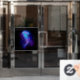 Large, blue, artistically drawn, glowing, bright jellyfish, with long tentacles on black background with purple bioluminescence. Luminous jellyfish.