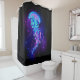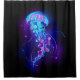 Large, blue, artistically drawn, glowing, bright jellyfish, with long tentacles on black background with purple bioluminescence. Luminous jellyfish.