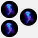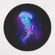 Large, blue, artistically drawn, glowing, bright jellyfish, with long tentacles on black background with purple bioluminescence. Luminous jellyfish.
