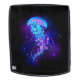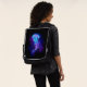 Large, blue, artistically drawn, glowing, bright jellyfish, with long tentacles on black background with purple bioluminescence. Luminous jellyfish.