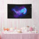 Large, blue, artistically drawn, glowing, bright jellyfish, with long tentacles on black background with purple bioluminescence. Luminous jellyfish.