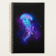 Large, blue, artistically drawn, glowing, bright jellyfish, with long tentacles on black background with purple bioluminescence. Luminous jellyfish.