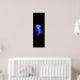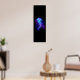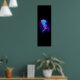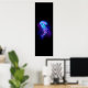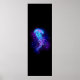 Large, blue, artistically drawn, glowing, bright jellyfish, with long tentacles on black background with purple bioluminescence. Luminous jellyfish.
