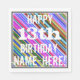 This fun birthday-themed paper napkin design features a message like "HAPPY 13th BIRTHDAY, NAME-HERE!", where the name can be customized. The background features a vibrant, multicolored stripes pattern. The message text is coloured white, and has a distressed appearance. Napkins like these could perhaps be used at a birthday party for somebody who is celebrating their thirteenth birthday. [~Z0000270]