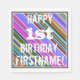 This fun birthday-themed paper napkin design features a message like "HAPPY 1st BIRTHDAY, FIRSTNAME!". The background features a vibrant, multicolored stripes pattern. The message text is coloured white, and has a distressed appearance. Napkins like these could perhaps be used at a birthday party for somebody who is celebrating their first birthday. [~Z0000270]