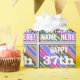This fun birthday-themed wrapping paper design features a message like "HAPPY 37th BIRTHDAY, NAME-HERE!", where the name can be customized. The background features a vibrant, multicolored stripes pattern. The message text is coloured white, and has a distressed appearance. Wrapping paper like this could perhaps be used when wrapping gifts or presents being given to somebody who is celebrating their thirty seventh birthday. [~Z0000272]