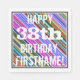 This fun birthday-themed paper napkin design features a message like "HAPPY 38th BIRTHDAY, FIRSTNAME!", where the name can be customized. The background features a vibrant, multicolored stripes pattern. The message text is coloured white, and has a distressed appearance. Napkins like these could perhaps be used at a birthday party for somebody who is celebrating their thirty eighth birthday. [~Z0000270]