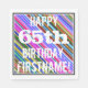 This fun birthday-themed paper napkin design features a message like "HAPPY 65th BIRTHDAY, FIRSTNAME!", where the name can be customized. The background features a vibrant, multicolored stripes pattern. The message text is coloured white, and has a distressed appearance. Napkins like these could perhaps be used at a birthday party for somebody who is celebrating their sixty fifth birthday. [~Z0000270]