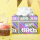 This fun birthday-themed wrapping paper design features a message like "HAPPY 69th BIRTHDAY, NAME-HERE!", where the name can be customized. The background features a vibrant, multicolored stripes pattern. The message text is coloured white, and has a distressed appearance. Wrapping paper like this could perhaps be used when wrapping gifts or presents being given to somebody who is celebrating their sixty ninth birthday. [~Z0000272]