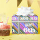 This fun birthday-themed wrapping paper design features a message like "HAPPY 6th BIRTHDAY, NAME-HERE!", where the name can be customized. The background features a vibrant, multicolored stripes pattern. The message text is coloured white, and has a distressed appearance. Wrapping paper like this could perhaps be used when wrapping gifts or presents being given to somebody who is celebrating their sixth birthday. [~Z0000272]