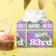 This fun birthday-themed wrapping paper design features a message like "HAPPY 83rd BIRTHDAY, NAME-HERE!", where the name can be customized. The background features a vibrant, multicolored stripes pattern. The message text is coloured white, and has a distressed appearance. Wrapping paper like this could perhaps be used when wrapping gifts or presents being given to somebody who is celebrating their eighty third birthday. [~Z0000272]