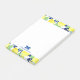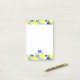 Trendy vibrant lemons and blue floral tile patterned post it notes with personalized text.