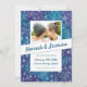 This save-the-date announcement comes complete with a beautifully hand painted watercolor border in teal and purple, embellished with hand-drawn white flowers. This invite is fully customizable, and gives you the option to display your favourite photo of you as a couple. This version features the names of the couple in larger letters, with the other information underneath.