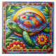 A beautifully crafted mosaic showcases a sea turtle as it glides through lush foliage. The turtle's intricate shell is adorned with vivid colours, while bright flowers surround it under a radiant sun, evoking a sense of joy and harmony in marine life.