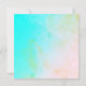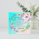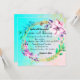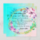 A brightly teal and muted tan pastel backdrop showcasing vibrant pink and purple shaded flowers on opposite sides of the wreath with some green branches thrown in for contrast. In the wreath are the wedding details in stylish fonts. Elegant and simple