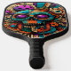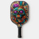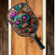 A paddle with a colourful design, ready for a game of pickleball. The bright colours add a fun and artistic touch to the traditional paddle.