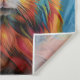 The image on this tapestry features a portrait of a guinea pig with an array of bright, multi-colored fur. The guinea pig is depicted with strands of fur in various hues of yellow, orange, red, blue, and green, giving it a rainbow-like appearance. The background is gradients of blue, allowing the vivid colors of the guinea pig to stand out prominently. The animal's eyes are large and glossy, suggesting a sense of curiosity or attentiveness. generativecontent