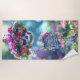 This beach towel features a striking and unique design, showcasing a skeleton adorned with a vibrant floral crown and garland. The skeleton stands amidst a lush garden filled with colourful flowers and greenery, creating a captivating blend of the macabre and the beauty of nature. The floral crown includes shades of pink, purple, red, and white, complemented by green foliage, while the background offers a dreamy, ethereal atmosphere with soft bokeh effects. Perfect for making a bold statement at the beach, this towel combines functionality with artistic flair