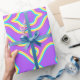 A repeating, symmetrical pattern in shades of purple, with light yellow, light blue, and light teal outlines creating a 3D effect. The colour palette is vibrant and cheerful, creating a playful and somewhat whimsical visual. The repetition of the design makes it seemingly infinite.