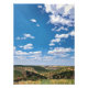 A stunning landscape showcases lush rolling hills beneath a bright blue sky dotted with fluffy clouds. The vivid colours and broad strokes capture the beauty of nature.