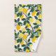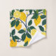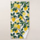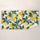 The pattern features a lively and vibrant design with lush lemon trees. The branches are adorned with ripe, bright yellow lemons, some of which are sliced open to reveal their juicy interiors. The lemons are surrounded by deep green leaves, which contrast beautifully with the warm, cream-coloured background. The overall style is bold and stylized, with clean lines and a sense of symmetry, creating a fresh and cheerful aesthetic that evokes a Mediterranean vibe.