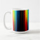 A white mug with a vibrant abstract design of colourful, glowing vertical stripes resembling a light spectrum on a dark base. (124 caractères)