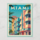 Colourful illustration of iconic Miami architecture featuring geometric patterns, pastel colours, and lush palm fronds casting shadows.