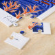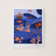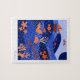 This puzzle features a vibrant, stylized landscape with a whimsical and modern aesthetic. It uses a rich color palette of deep blues and orange an to create a layered, multi-dimensional scene with imaginative details, including flying fish, birds, a small sailboat, and coral reefs. The design is characterized by clean lines and high-contrast colors that give it a playful yet sophisticated feel.