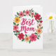 Designed with a bright digital illustration, this Mother’s Day card centers a loving message inside a ring of flowers that feels like a gentle hug ❤️. In the middle, the words “Best Mom” sit prominently in flowing fuchsia lettering, with rounded strokes that look soft and affectionate. The text is placed dead center, leaving airy space around it so the message stands out clearly against the white background. Surrounding it is a circular wreath of stylized blooms and leafy greens, arranged evenly to suggest care and closeness. The flowers mix scarlet red, rosy pink, golden yellow, and apricot orange petals, each with a darker, textured center that adds depth without looking busy. Green leaves in slightly different shades weave between the blossoms, and small muted grey‑green dots appear here and there like tiny connectors 🌼. The background stays plain white while the wreath forms a neat circle around the fuchsia words.