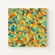 Vibrant mosaic pattern composed of various coloured shapes, primarily hexagons and polygons. The colours include bright shades of orange, yellow, turquoise, and blue, creating a lively and energetic visual effect.