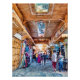 A lively north african bazaar filled with shoppers exploring the colourful textile displays. Intricate ceiling designs add to the vibrant atmosphere, capturing a rich cultural experience.