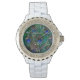 A vibrant colourful style peacock feathers graphic decor on a fine custom personalized fashion watch.