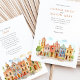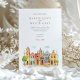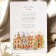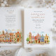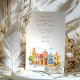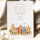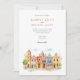 Invite your guests to a joyous and colourful celebration with this captivating watercolor wedding invitation, featuring the vibrant colonial architecture of Puebla, Mexico. The artwork beautifully showcases a streetscape of brightly coloured buildings, including facades in warm yellows, rich pinks, oranges, and distinctive blues, some adorned with traditional Talavera-style tile patterns (like the diamond/harlequin design). Characteristic church towers with terracotta domes rise above the scene, all rendered in a soft, vibrant watercolor style. The scene is framed by delicate green leafy sprigs and features small green bushes and a stylized tree, adding a touch of natural charm. This invitation is perfect for a destination wedding in Mexico, or for couples who adore lively culture, colourful architecture, and artistic flair. The front elegantly presents your wedding details, while the reverse side offers "The Finer Details" for guest information. The colour palette is a festive blend of sunny yellows, warm oranges, vibrant pinks, terracotta reds, various shades of blue, and fresh greens, set against a soft sky.