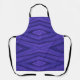 "Vibrant purple apron with geometric pattern displayed on white background and worn by a smiling person. The design has layered diamond shapes."