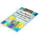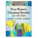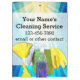 Personalize this colourful full-colour promotional business product with your cleaning or janitorial company name and details. Features aqua and bright blue rays of light background with a yellow gloved hand holding feather duster, a green bucket with rag, and blue spray solution.
