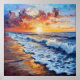 In the foreground, the waves gently lap against the shore, their foamy edges merging with the reflective surface of the wet sand. The beach is illuminated by the sunlight, showcasing a palette of warm browns and shimmering golds. The overall composition conveys a sense of tranquillity and the beauty of nature, enhanced by the rich brushwork that adds depth and movement to the scene.