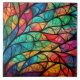 A mesmerizing stained-glass-inspired abstract design featuring intricate leaf-like patterns in a spectrum of rich, glowing colours. The interplay of reds, blues, greens, and yellows creates a dynamic and harmonious composition, reminiscent of a radiant autumn tree or a kaleidoscopic mosaic. Perfect for decorative ceramic tiles, trivets, or artistic prints to bring elegance and energy to any space.