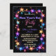 This dazzling New Year's Eve Party Invitation features a sophisticated, galactic black background that sets a luxurious tone for your celebration. The design is framed by a winding border of illuminated star-shaped string lights glowing in a vibrant, mesmerizing spectrum of pink, purple, blue, and gold. Inside this luminous frame, the custom text uses a stylish mix of fonts: a playful handwritten script for "Party" in pink and a clear, modern purple for the event details. This customizable invitation is the perfect luminous beacon to announce your sparkling New Year's bash, ready for your date, time, address, and RSVP information.