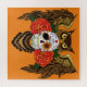 This bold sugar skull owl design blends Día de los Muertos symbolism with striking gothic style. A detailed brown owl with outstretched wings frames a decorative sugar skull adorned with colourful floral accents, a diamond motif, and vibrant red roses. Set against a rich orange background, this artwork captures a dramatic mix of wisdom, mystery, and romantic gothic beauty.
